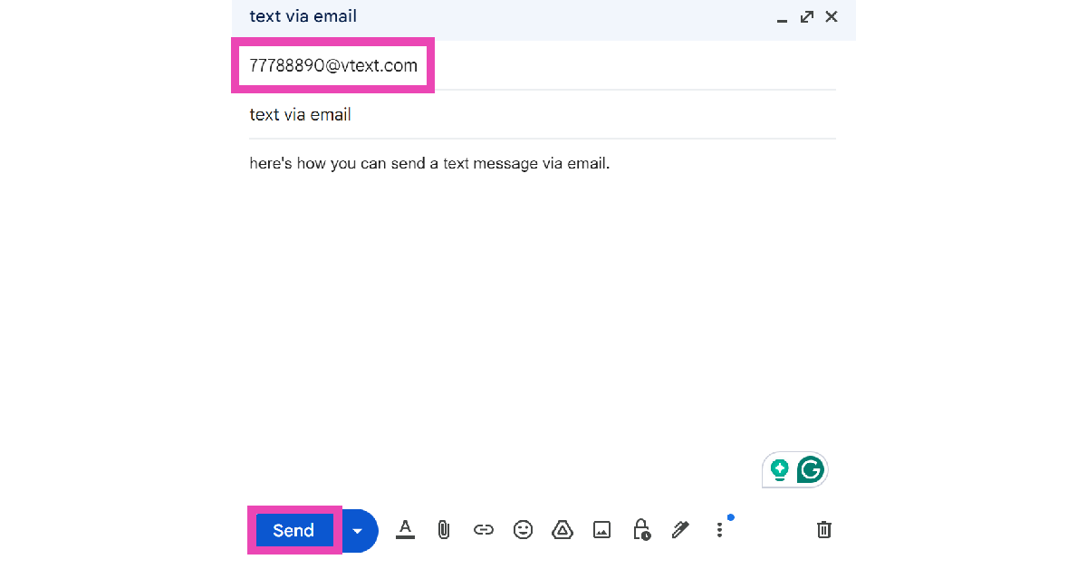 ステップ2:受信者のアドレスフィールドに、受信者を入力します電話番号その後、サービスプロバイダーのSMSゲートウェイが続きます。たとえば、VerizonのSMSゲートウェイはですvtext.com。 AT&Tの場合、ゲートウェイはですtxt.att.net。受信者番号が「7778889990」の場合は、入力してください7778889990@vtext。受信者アドレスフィールドのcom。