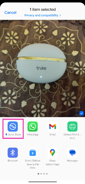 ファイルを開き、「共有」アイコンを押し、「Quick Share」をタップし、ターゲットデバイスを選択します。