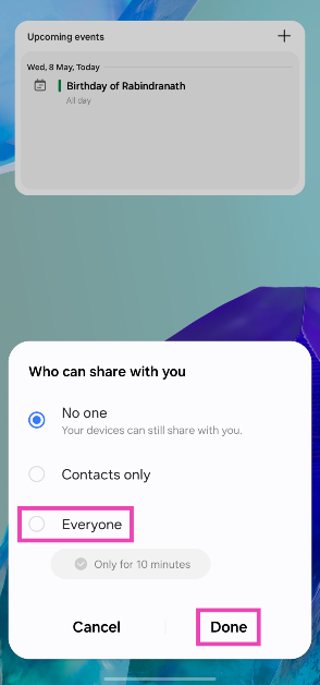 ステータスバーからスワイプして、クイック設定メニューを表示し、クイック共有をタップし、「全員」を選択します。