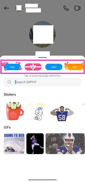 テキストボックスにメッセージを入力し、拡大ガラスアイコンを押して、一番上の行から特殊効果を選択します。特殊効果は、長いメッセージでは機能しません。