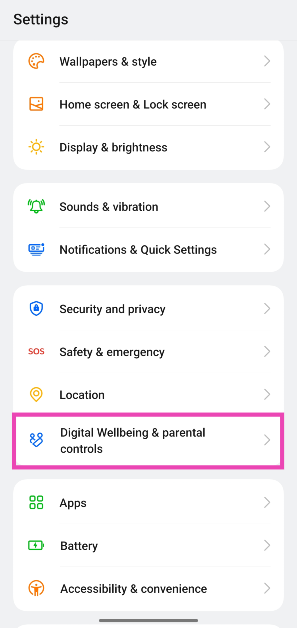 ステップ1:行きます設定タップしますデジタルウェルビーイングと親のコントロール。