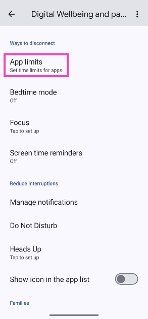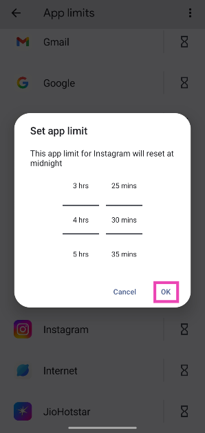 行きます設定>デジタルウェルビーイングと親のコントロール>アプリ制限アプリの横にある砂時計のアイコンをタップします。スライダーを使用して時間制限を設定し、「OK」を押します。