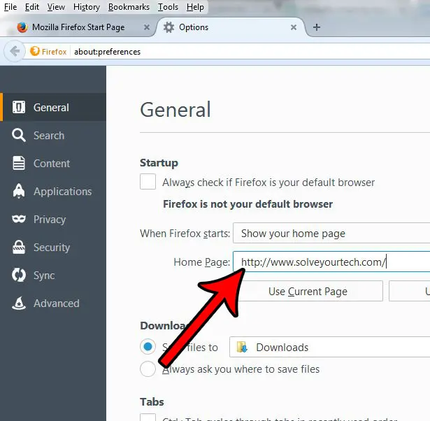 ステップ4:目的のWebページアドレスを入力(または貼り付けて)にホームページ分野。その後、タブを閉じることができます。 Firefoxは変更を自動的に保存するため、追加のボタンをクリックする必要はありません。