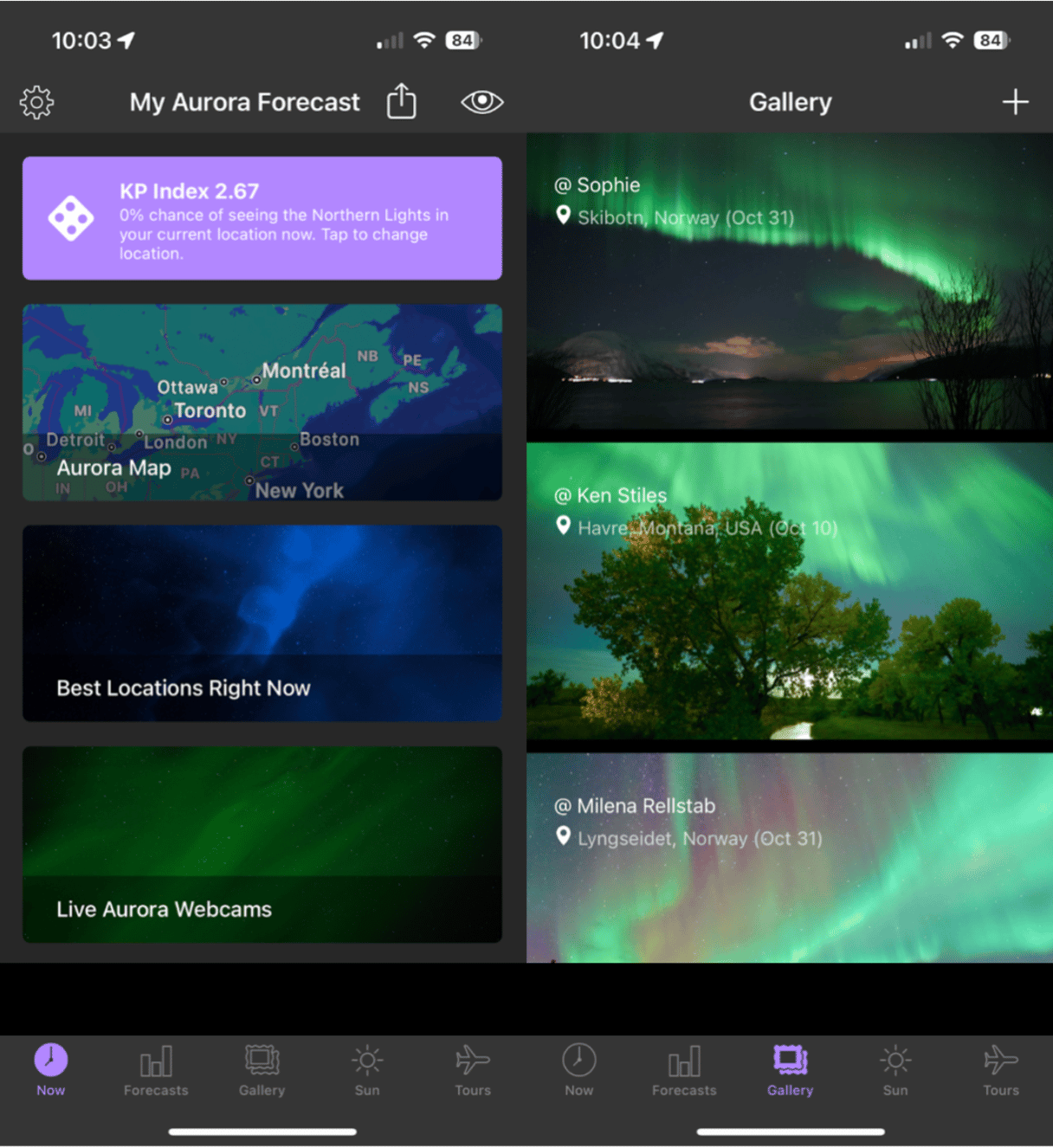 - 次のようなアプリを使用しますオーロラの予測オーロラを見るのに最適な日付、時間、場所を見つけるのに役立ちます。