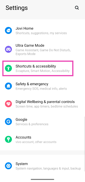 ステップ1:行きます設定選択しますショートカットとアクセシビリティ。