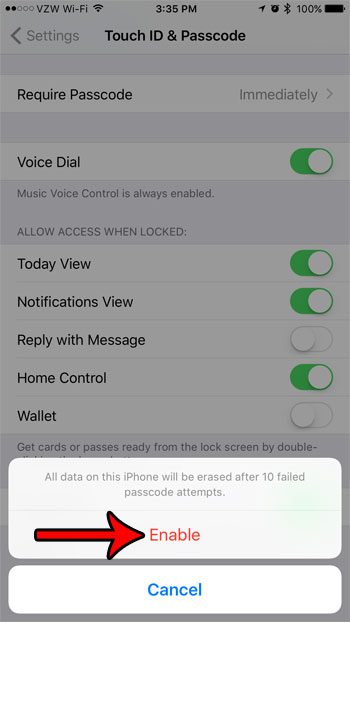 ステップ5:タップします有効にするパスコードが10回誤って入力された場合、iPhoneのデータが消去されることを理解することを確認するボタン。
