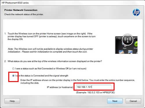 ステップ12:選択しますステータスが接続され、信号強度が接続されていることがわかりますオプション、最後のステップからIPアドレスを入力してくださいIPアドレスフィールド、次にタップします次ボタン。最後のステップでIPアドレスを見逃した場合、プリンターのタッチスクリーンでワイヤレスアイコンをタップして、いつでも見つけることができます。ステップ7。