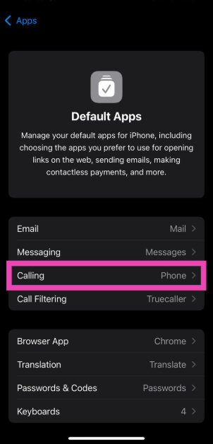 iPhoneの次の機能のデフォルトアプリを変更できます:電子メール、メッセージング、通話、通話フィルタリング、Webブラウジング、キーボード、パスワードとコード、非接触アプリ。