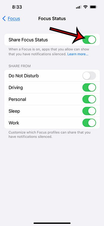 行きます設定>フォーカス>フォーカスステータス>そして、オフにしますフォーカスステータスを共有しますオプション。