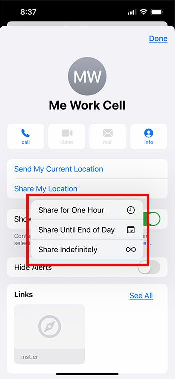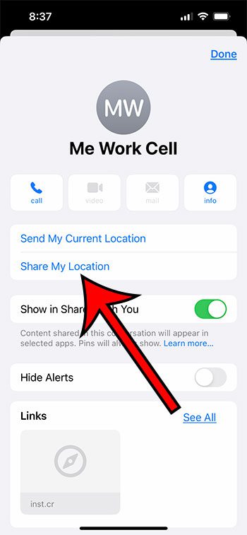 あなたは開くことでiPhoneであなたの場所を共有することができますメッセージ、会話を選択し、連絡先名をタップし、選択します私の場所を共有してください、および期間を選択します。