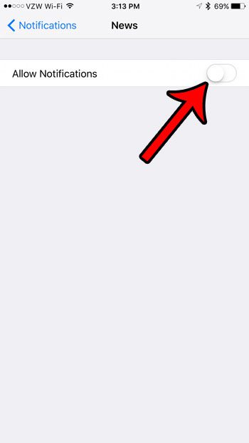 ステップ4:右側のボタンをタッチします通知を許可しますそれらを完全にオフにします。ボタンの周りに緑の陰影がなく、ニュースアプリの残りの通知オプションが消えたときに無効になっていることがわかります。