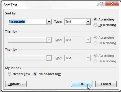 ステップ5:このウィンドウのドロップダウンメニューからニーズの正しいオプションを選択し、[わかりましたボタン。また、テキストのみを並べ替える必要はないことにも注意してください。日付や番号でも並べ替えることもできます。