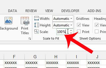 ステップ3:内部をクリックします規模のフィールドフィットするスケールウィンドウの上部にあるナビゲーションリボンのセクション、そのフィールドの値をに変更します100%。必要に応じて別のサイズに変更することもできますが、100%がデフォルトサイズで印刷することもできます。その後、キーボードのEnterを押すか、スプレッドシートの別の部分をクリックして変更を適用できます。