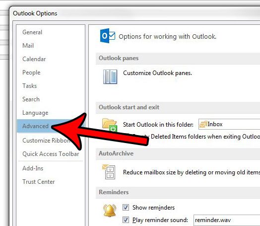 ステップ4:クリックします高度なのタブOutlookオプションウィンドウ。