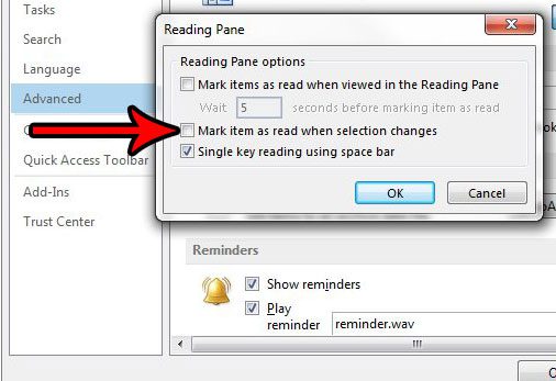 ステップ6:左側のボックスをクリックします選択が変更されたときに読み取りとしてアイテムをマークしますチェックマークを削除します。その後、クリックできますわかりましたこのウィンドウとOutlookオプションこれらの変更を適用して保存するためのウィンドウ。