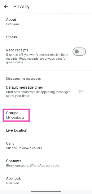 プライバシー設定で連絡先のみがWhatsAppグループに追加できる場合、他の人はランダムグループに追加することはできません。連絡先のリストに誰かを追加して、グループに追加できるようにしたい場合は、連絡先のリストに追加します。または、行くこともできます設定>プライバシー>グループそして、誰もがあなたをグループに追加できるようにします。