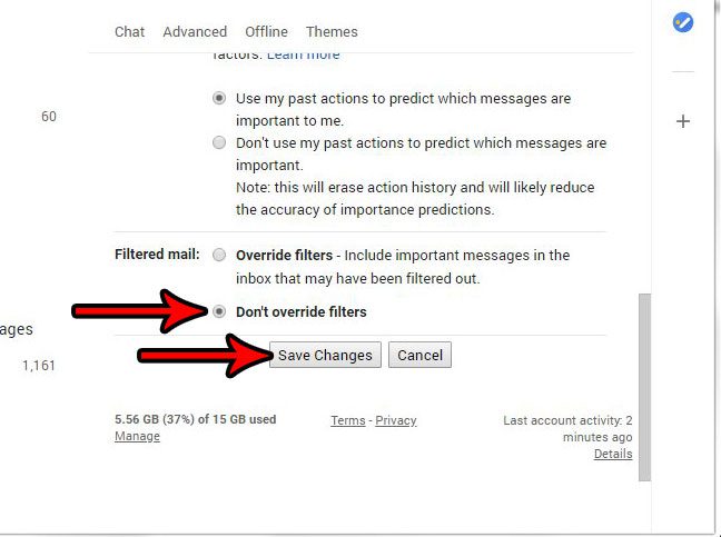 ステップ4:メニューの下部までスクロールして、フィルターをオーバーライドしないでくださいオプション、次にクリックします変更を保存しますボタン。