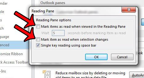 ステップ6:左のボックスをチェックします読書ペインで表示されたときに読み取られたアイテムをマークします、次に、左のボックスをチェックします選択が変更されたときに読み取りとしてアイテムをマークします。クリックしますわかりましたウィンドウを閉じるためのボタン。