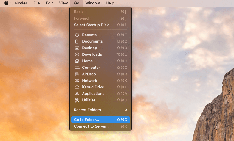 開始するには、画面の上部に移動して「GO」をクリックします。ドロップダウンメニューから、[フォルダに移動]を選択します。