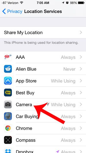 iPhone 5カメラの場所をオフにすることができます> [プライバシー]> [ロケーションサービス]> [カメラ]オプションを選択して選択しないようにします。