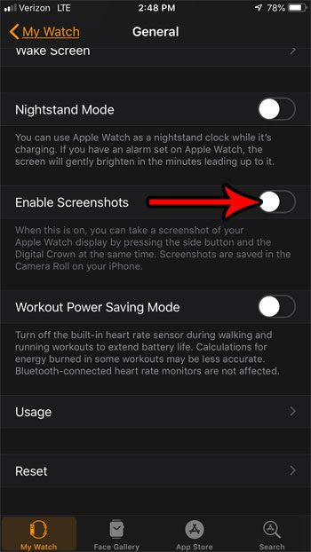 ステップ4:このメニューの下部にスクロールし、右側のボタンをタップしますスクリーンショットを有効にしますそれをオフにします。下の写真で、Apple Watchのスクリーンショットを無効にしています。
