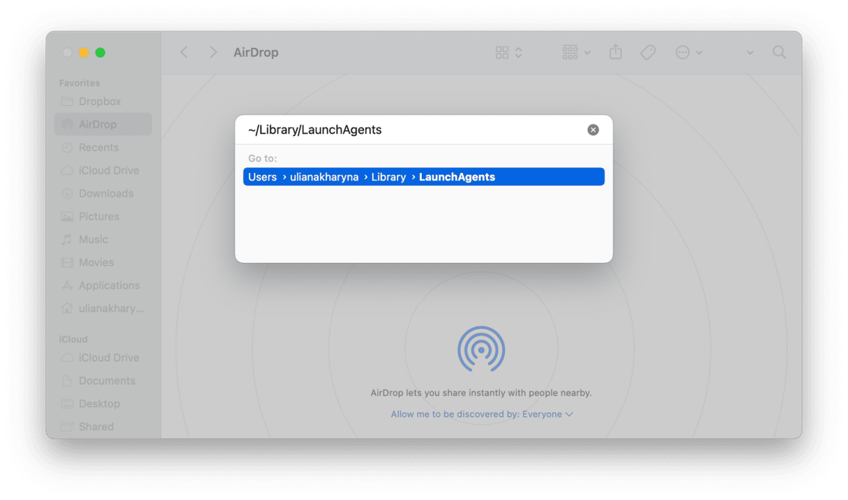 ~/Library/LaunchAgentsreturnを押します。 - そのフォルダーでは、背景アイテムが停止したいアプリの名前のファイルを探します。見つけたら、ファイルをゴミにドラッグします。