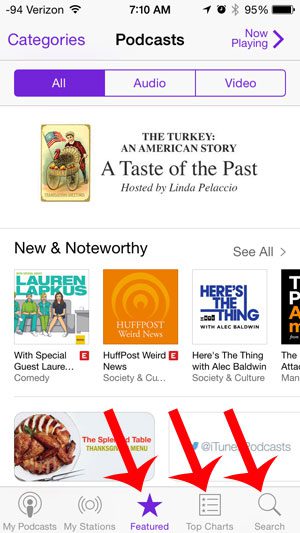 ステップ2:を使用します注目の、トップチャートまたは検索画面の下部にあるオプションで、サブスクライブするポッドキャストを見つけます。