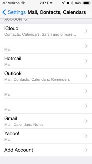 このチュートリアルでは、iPhoneに複数のメールアカウントが設定されていると想定しています。タップして、構成された電子メールアカウントを表示できます設定>メール、連絡先、カレンダー、次のアカウントはすべてそこにリストされます。下の画像のように -