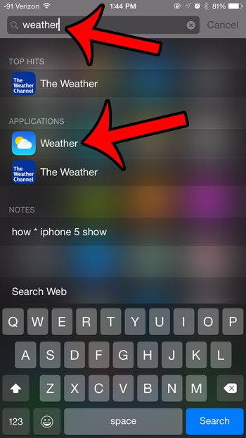 ホーム画面に直接表示されていない場合は、フォルダーにある可能性があります。フォルダでそれを見つけることができない場合は、画面の上部からいつでもスワイプしてスポットライト検索を開くことができます。天気検索フィールドに入り、開きます天気アプリ。