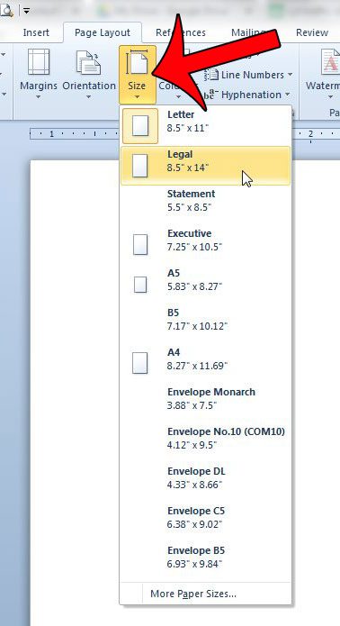 ステップ3:クリックしますサイズのボタンページのセットアップナビゲーションリボンのセクション、次に、目的のページサイズを選択します。必要なページサイズのオプションが表示されない場合は、より多くの紙のサイズメニューの下部にあるオプション。