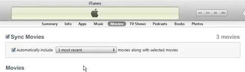 これにより、ウィンドウの中央に表示されるディスプレイが変更され、デバイスと同期できるファイルの各ファイルごとにこのセクションの上部にタブがあります。ファイルの各タイプのタブをクリックして、それらのファイルの同期設定を選択します。たとえば、以下の画像では、映画タブ。左側のボックスを確認します映画の同期iPadに同期するときにこれらのファイルを含めるには、[ドロップダウン]メニューをクリックして、デバイスに同期すべき映画の数を指定します。