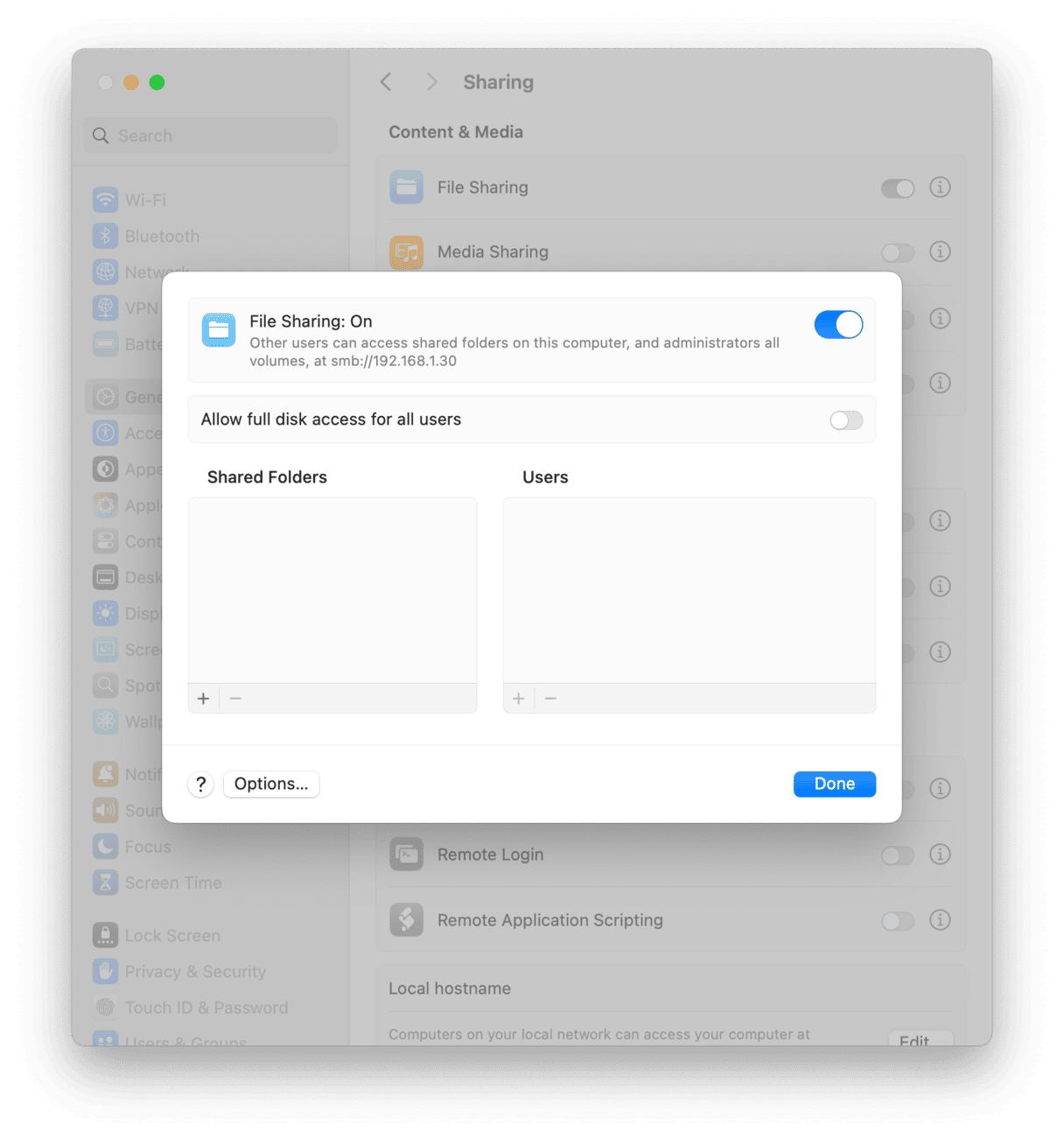 - ファイル共有の横にある[情報]ボタンをクリックして、オンにします。 Mac全体を共有したい場合は、完全なディスクアクセスを許可してください。