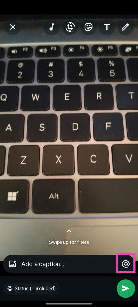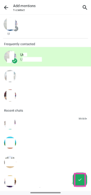 ステータスアップデートの画像またはビデオを選択し、キャプションバーの @アイコンをタップして誰かにタグを付けます。リストから連絡先を選択し、緑色のアイコンを押して更新を投稿します。