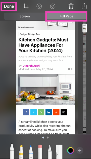 ボリュームダウンキーのあるサイドボタンを押して、スクリーンショットを取得し、スクリーンショットプレビューの下の「長いスクリーンショット」オプションをタップします。
