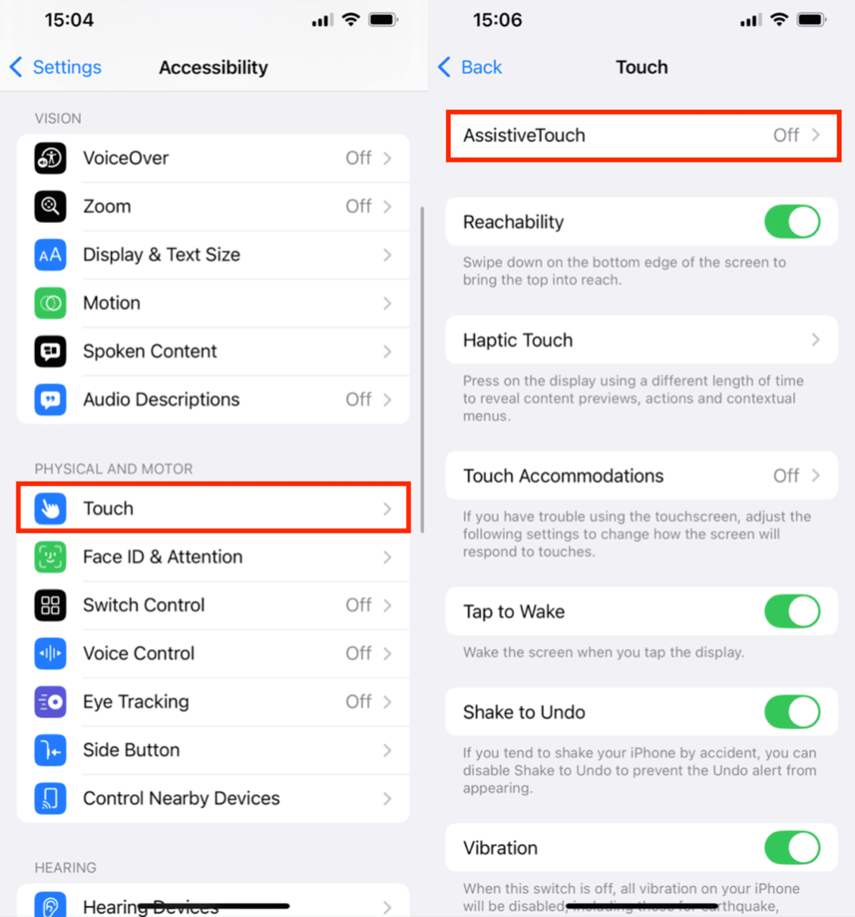 最初にしなければならないことは、補助的なタッチをオンにすることです。そのために、[設定]> [アクセシビリティ]> [タッチ]> [AssistveTouch]に移動します。 Assistvetouchトグルをオンにします。