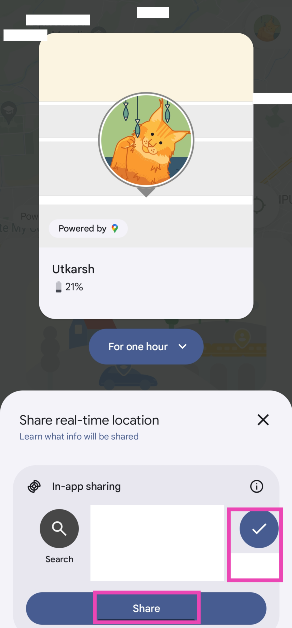 私のデバイスアプリの検索を起動してください人々>新しい共有、期間を設定し、連絡先の名前をタップし、「共有」を押します。