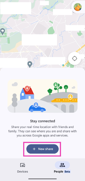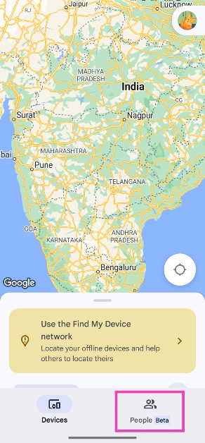 携帯電話で私のデバイスアプリの検索を起動すると、「デバイス」セクションに着陸します。位置共有機能は、まだベータフェーズにある新しい「人」タブに隠れています。場所を連絡先と共有することを選択したら、彼らがあなたを追跡できる期間を決めることができます。現在、私のデバイスが次のオプションを提供しているのを見つけてください。