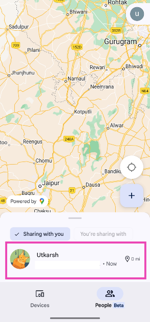 誰かが私のデバイスを見つけて自分の場所を共有している場合は、アプリを起動し、タブに移動し、名前をタップしてそれらを追跡します。