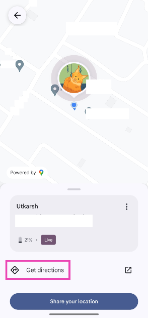 誰かが私のデバイスを見つけてライブロケーションを共有したら、「道順を取得」ボタンを押して、Googleマップナビゲーションルートを現在の場所に起動できます。