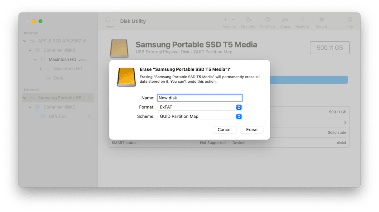 - フォーマットメニューからフォーマットを選択します。 Windows PCでドライブを使用する場合は、EXFATを選択してください。