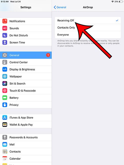ステップ4:を選択しますオフになりますiPadのエアドロップ上に誰もがファイルを送信できないようにするオプション。