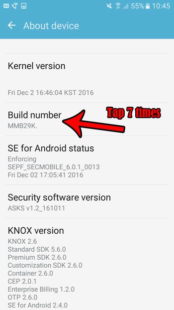 ステップ4:下にスクロールしてタップしますビルド番号オプション7回。これはロック解除されます開発者モード。