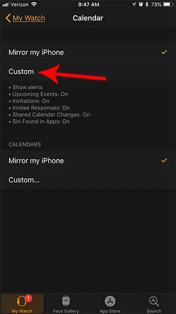 に行くことによってウォッチアプリ>私のウォッチタブ>通知>カレンダー画面の上部にあるカスタムオプションにタッチして、すべての通知をオフにすることを選択するか、カレンダーの招待状のみ、または共有カレンダーアラートの更新のみが表示されるか、誰かがカレンダーの招待状を受け入れたり拒否したりした場合にのみ表示されるようにカスタマイズできます。