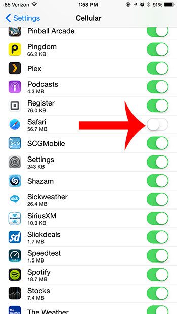 ステップ3:下にスクロールして、右側のボタンをタップしますサファリ。下の画像のように、ボタンの周りに緑色のシェーディングがないときにオフになっていることがわかります。