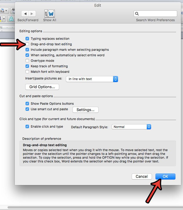ステップ4:左側のボックスをクリックしますドラッグアンドドロップテキスト編集チェックマークを削除します。クリックしますわかりましたメニューの下部にあるボタンは、変更を保存して適用します。
