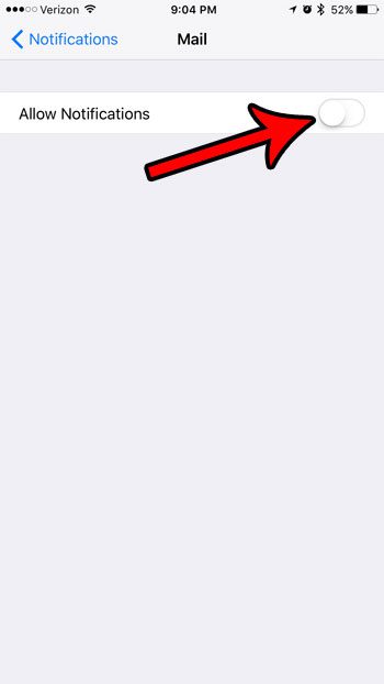 ステップ4:右側のボタンをタッチします通知を許可しますそれをオフにします。この画面上の残りのオプションのすべてが消えたときに、電子メール通知がオフになり、ボタンの周りに緑色のシェーディングがないことがわかります。下の写真で、すべてのメール通知を無効にしました。