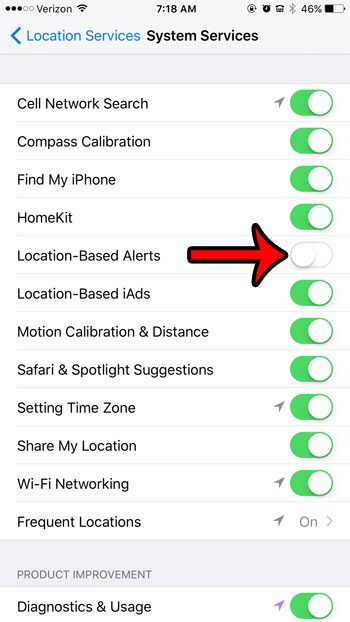 ステップ5:右側のボタンをタップしますロケーションベースのアラートそれをオフにします。
