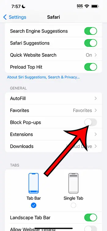 iPhone 14のSafariポップアップブロッカーは、設定> safari>その後、オフになりますブロックポップアップオプション。