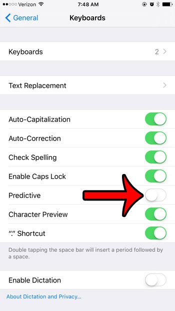 ステップ4:右側のボタンをタップします予測それをオフにします。ボタンの周りに緑のシェーディングがない場合、設定がオフになっていることがわかります。下の写真では予測がオフになっています。