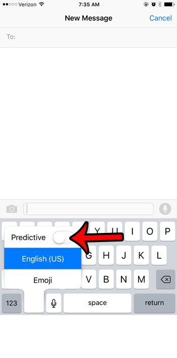 もう1つのオプションは、マイクとスペースバーの左側の言語ボタンをタップして保持し、次のスライダーを移動することです。予測左の方です。下の写真では、そのアイコンはスマイリーフェイスです。なぜなら、私はデバイスで設定した唯一の言語である絵文字を有効にしたからです。そのアイコンは、デバイスの設定に基づいて、グローブのように見える場合もあります。